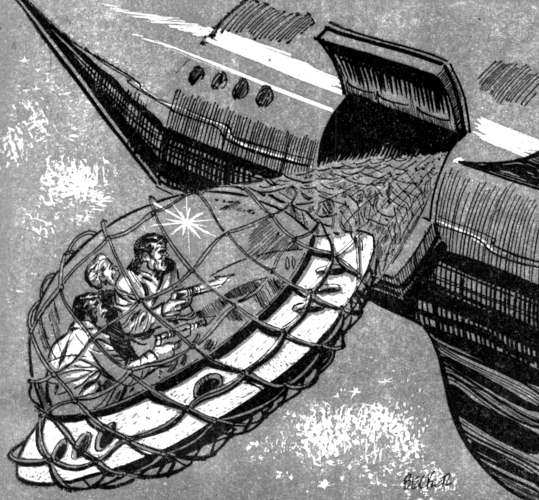 They sat huddled together in the tiny space-survival unit, watching the big rocket freighter draw closer to their drifting position off Saturn.