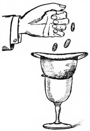 The Penetrating Coin.—This coin trick may be performed anywhere, and requires no special preparation. A borrowed Derby hat is placed upon the mouth of a tumbler (Fig. 8). Three half-dollars are now borrowed and tossed into the hat, whereupon one of the coins is seen to penetrate the crown of the hat, and drop visibly and audibly into the tumbler beneath. It is thus explained: In the act of placing the hat on the glass, secretly and without jingling slip a coin of your own between the rim of the glass and the hat. The weight of the latter will retain the coin in its position, which, of course, is on the side of the hat farthest from the spectators. The dropping of the borrowed coins in the hat will disturb the balance of the secret half-dollar, causing it to fall into the tumbler. It is hardly necessary to remind the student that the fourth coin must be gotten rid of unbeknown to the audience, otherwise the effect is destroyed. In putting the hat in position two hands may be used. This will greatly facilitate the placing of the coin on the rim of the tumbler. You should lay stress on the fact that it is necessary to get the hat evenly on the glass. As simple as this trick seems in explanation, it is nevertheless wonderfully illusive, and can be especially recommended to the amateur.