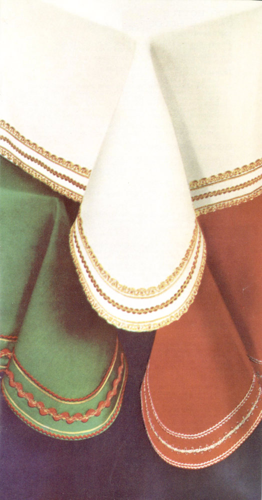 3. Stitch rick rack around edge of oil cloth. Stitch a row 2″ from first on 18″ sides. Add braid 9882 (P511) between.