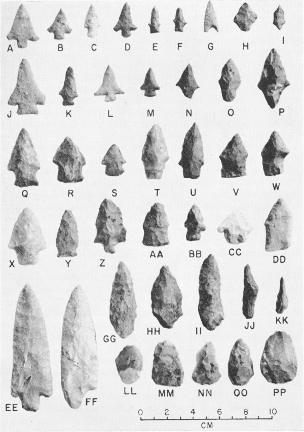 There are 15 small scrapers (Fig. 11, MM-PP) which are ovate or triangular in outline and made from flakes which vary from 3 to 8 mm. in thickness. They are of tan, brown and mottled gray chert, petrified wood, and gray quartzite. Most are flaked bifacially but some show a preponderance of flaking on the convex face. Sizes range from 2 to 4.5 cm. Five small broken flake objects show some flaking.