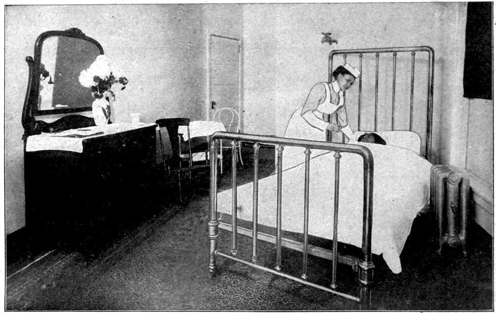 If it is necessary to enter a sick room, particularly where there is fever, these simple rules should be observed to avoid contagion. Never enter fasting. At least take a few crackers or some such 429simple food before going in. Do not stand between the patient and the door where the current of air would naturally strike you. Avoid sitting on or touching the bed clothes as much as possible, and do not inhale the patient’s breath. The hands should always be washed in clean water before leaving the room, in order not to carry infection by them to other people or things you may need to touch. After visiting a fever patient change the clothes if possible. As soon as a fever is over and the patient is convalescent, the dress which has been used by the nurse should be fumigated in the same manner as the bedding, as already explained.