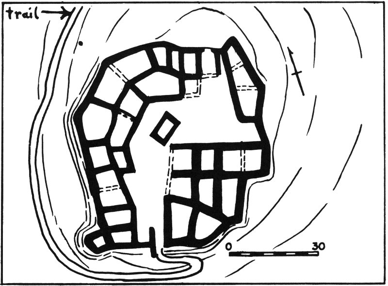 This ruin has never been excavated. It might tell a story of peaceful farming people finding it necessary to defend themselves from neighboring tribes. Around the depression in the middle there is space for an estimated 30 rooms; the outlines of some can readily 10 be seen. Approximately 50-60 persons probably lived in this village.