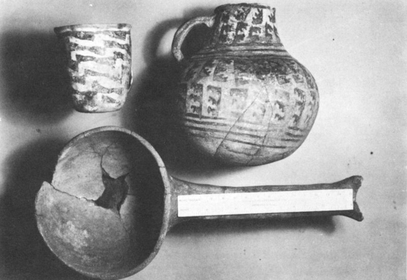 Pottery from cremation burials, a mug, pitcher, and a ladle.