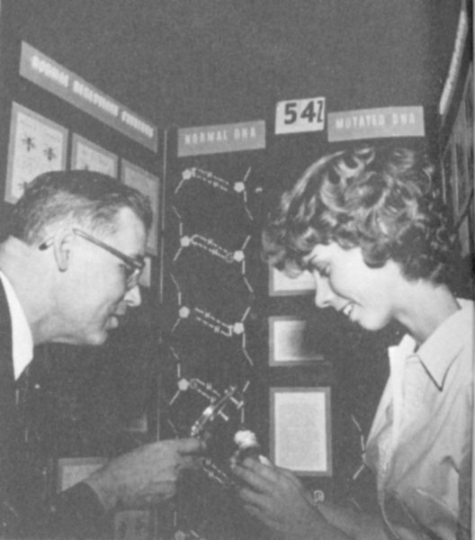 Interviews help AEC Special Awards judges identify the most outstanding nuclear-related exhibits entered in each National Science Fair-International. Here, Elizabeth Winstead of Jacksonville, Florida, explains her irradiated fruit flies to Dr. Paul W. McDaniel, AEC Director of Research and a Special Awards judge at the 1963 national fair, Albuquerque, New Mexico. Selected as one of the 10 winners, Miss Winstead and her science teacher spent a week at the Commission’s Argonne National Laboratory near Chicago.