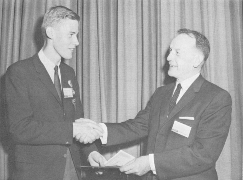The growing international flavor of the national science fair is exemplified in contestants like Anders S. Brahme, Sweden’s entrant at Albuquerque in 1963, and the first non-U. S. student to achieve Atomic Energy Commission Special Awards recognition. He was one of 10 alternates to the 10 winners and is shown receiving a Certificate of Achievement from Harry S. Traynor, AEC Assistant General Manager.