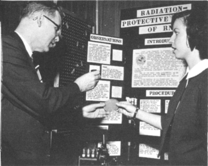 Sophomore Eileen O’Brien of New Dorp High School, Staten Island, New York, displayed this nuclear-related exhibit at the 13th NSFI at Seattle in 1962, but did not win any AEC recognition.