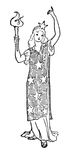 The woods in winter. If scenery is not available, a generous supply of white sheets and cotton batting will make an effective setting, with a few small evergreens, and bare boughs. A large Christmas tree should be utilized as part of the scene; place it to right of center, and trim lightly with silver tinsel, “snow,” and glass icicles. Near the tree, a couch or seat should be built up and covered with white, to represent a little mound; upon this the Queen sits, and later, the children recline. The time is about sunset; a red light, if available, will be effective early in the scene, while toward the end it grows darker. A curtain is not absolutely necessary, although of course more “like a play.”