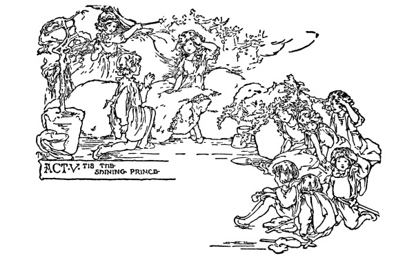 The Queen and her Fairies are in white, with silver tinsel and crystal ornaments, and carry wands with silver stars. They may wear either trailing draperies, or short “Pierrette” dresses, with silver ruffs, rosettes, and little pointed caps.