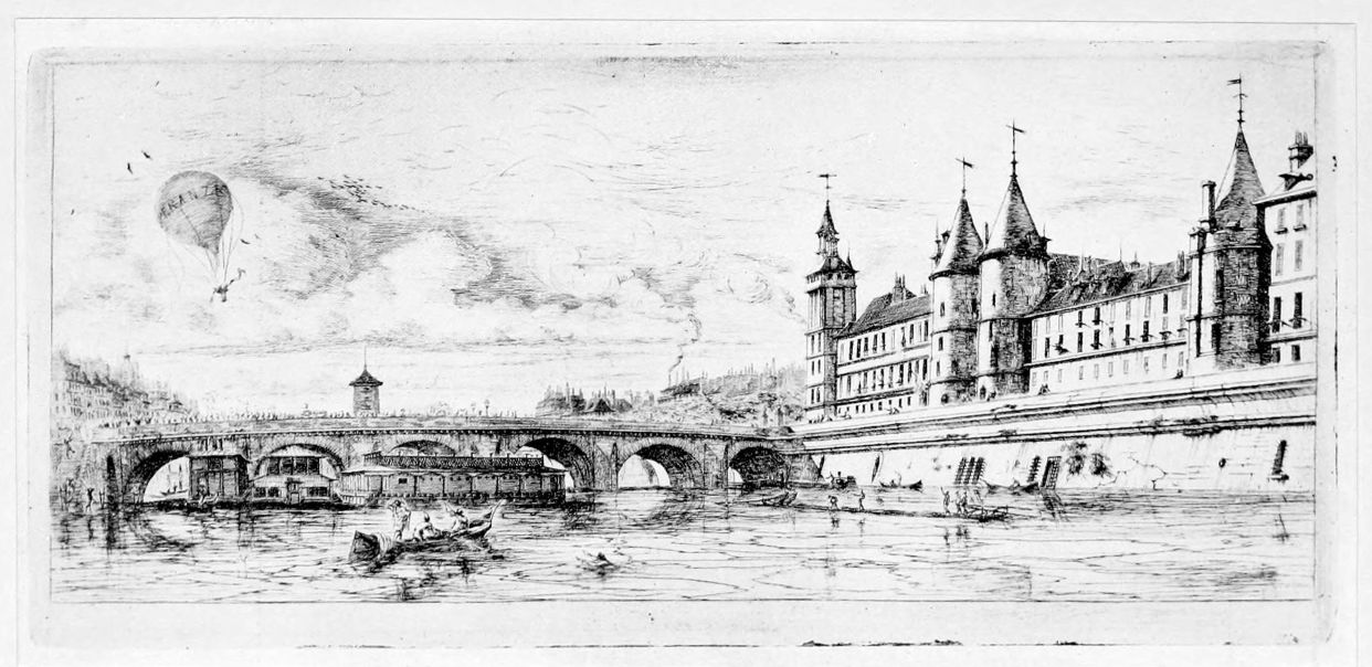 Le Pont-au-Change (plates 17, 18), etched in 1854, shows again Le Châtelet and the Tour de l’Horloge, and, beyond the bridge, the tower, with which we are now familiar, of La Pompe Notre-Dame. This etching is remarkable for the{16} many changes introduced into the sky in successive states. From the second to the sixth state of Delteil there is a balloon floating in the sky towards the left, inscribed SPERANZA (plate 17), to which the verses L’Espérance (plate 19) allude. In the seventh state this balloon disappears; in its stead there are great flights of birds across the sky, of which the lower resemble wild duck, while the upper ones, with longer wings, have got hooked beaks which make them look more like birds of prey than the jackdaws which one would expect to fly round the towers of a city. These remain (plate 18) during several alterations in the plate, until the tenth state, when they have disappeared from the left, though a concentrated flock wheels about the Tour de l’Horloge, and their place is taken by new balloons, near and distant, and in the eleventh state by still more balloons, one of which bears the name of Vasco de Gama. This is all rather crazy, and the alterations were made, like those on other plates to which we shall refer later, after Meryon’s mind had finally become deranged. This is evidently the etching referred to in a letter from Baudelaire to Poulet Malassis (quoted by M. Loys Delteil): “Dans une de ses grandes planches, il a substituté à un petit ballon une nuée d’oiseaux de proie, et, comme je lui faisais remarquer qu’il était invraisemblable de mettre tant d’aigles dans un ciel parisien, il m’a répondu que cela n’était pas dénué de fondement, puisque ces gens-là (le gouvernement de l’Empereur) avaient souvent lâché des aigles pour étudier les présages, suivant le rite,—et que cela avait été imprimé dans les journaux, même dans le Moniteur. Je dois dire qu’il ne se cache en aucune façon de son respect pour toutes les superstitions, mais il les explique mal, et il voit de la cabale partout.” This letter dates from January 1860, a few months after Meryon had been released from his first confinement in an asylum, and it must be observed that any eccentricities due to mental derangement can only be traced in plates etched subsequently to 1859, or in the late states, produced by re-touching after that date, of the “Eaux-fortes sur Paris” them{17}selves, which, as first completed in 1854, the year of this publication, had been perfectly normal.