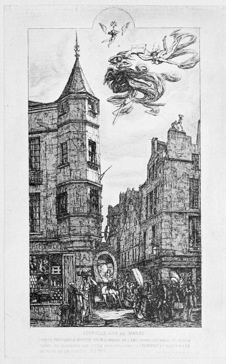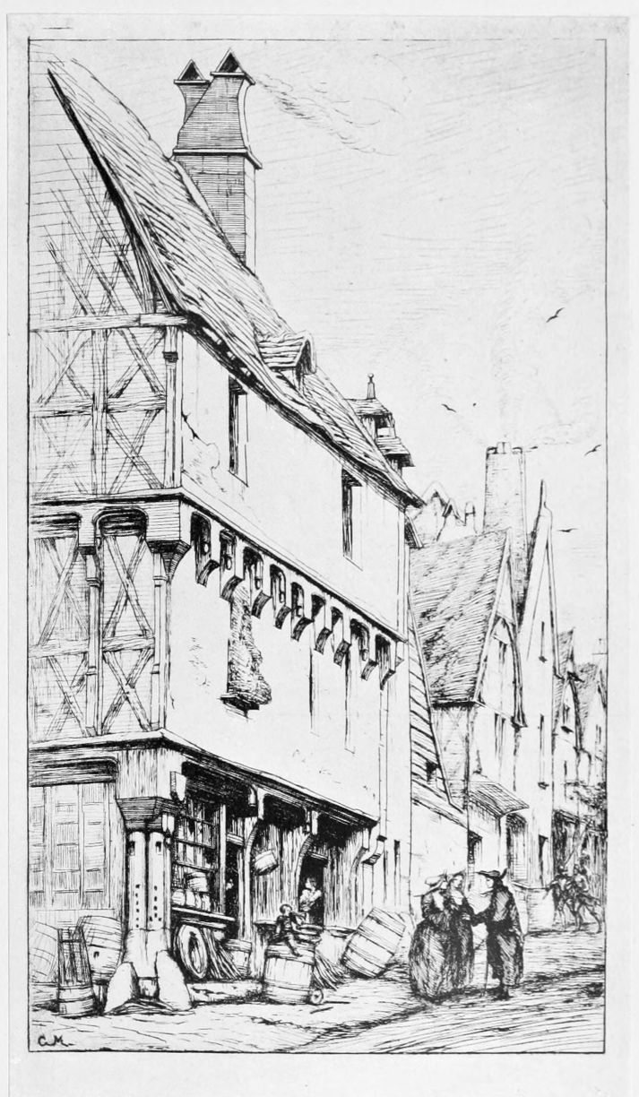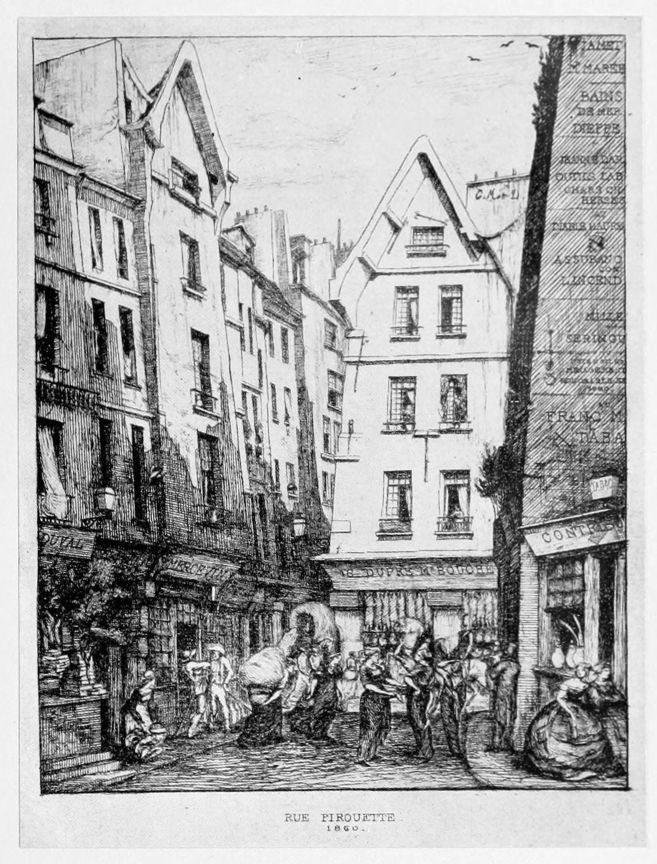 La Rue des Mauvais Garçons (plate 10), which formed the cul-de-lampe or tail-piece of the first livraison of “Eaux-Fortes sur Paris,” has always impressed modern observers as one of the most powerful and impressive of the etchings, fraught with mystery, enigmatic, suggestive of long past tragedies. “Quel mortel habitait,” are the verses etched on the building, “En ce gîte si sombre? Qui donc là se cachait Dans la nuit et dans l’ombre?” Was it Virtue, in silent poverty; was it Crime? No answer to the riddle is attempted. The street exists no longer.