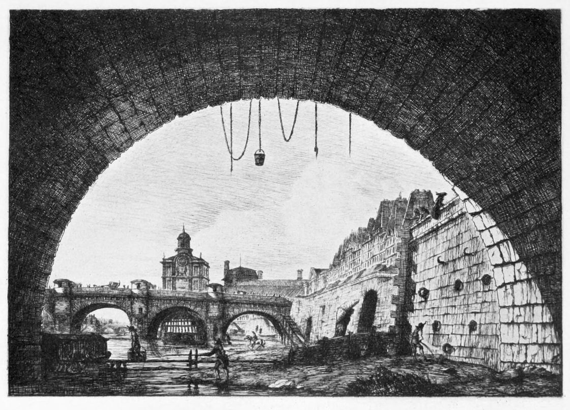 Bléry as an etcher has little interest for us, but he was sufficiently skilled to impart in six months a sound technique to a pupil, whose interest in the art was fostered by the study of old etchings and especially those of the Dutch etcher of architecture and marine subjects, Renier Zeeman (1623-1663), which he used to pick up for a few sous in the boxes outside the printsellers’ shops. Meryon’s first etching of all was a head of Christ, founded on a miniature after Philippe de Champaigne; the only impression known of this etching is in the Howard Mansfield collection at New York. During the years 1849-50 he produced a number of copies after Loutherbourg, Salvator Rosa, Karel du Jardin and others, but Zeeman fascinated him above all in the double capacity of an etcher of marines and of views of old Paris, and it was from his style that he learnt most. While still with Bléry his mind is said to have been slightly unhinged by an unfortunate love affair with the daughter of a restaurant keeper, who would have nothing to say to him. In solitary wanderings about the old streets of Paris and meditations in his garret in the Rue St. Etienne-du-Mont, he formed plans for his series of etchings of old Paris and began to make studies for them. As early as 1850 one of these masterly plates, Le Petit Pont (plate 7), was finished.