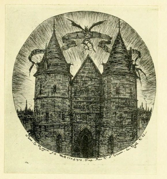 The frontispiece (plate 4), a round composition in which a devil carrying a great scroll hovers against a lurid sky over the Gothic gateway of the Palais de Justice, is a sinister design. The Tomb of Molière (plate 23), tail-piece to the set, was etched on the same plate, and a proof exists from the undivided copper containing both designs. The verses following the frontispiece are a comment on the latter, and express Meryon’s conviction that the city of Paris, “Paris le Paradis des amours et des Ris,” is possessed by a “noir Diabloton, malicieux, mutin,” fostered by science, and that this “méchant animal, Origine du mal” cannot be exorcised without razing the city to the ground. These etched verses are very rare. The symbolical coat of arms of the city of Paris (plate 5) is another of the minor pieces inserted in 1854, when the set was being completed. Then follows Le Stryge (plate 6), etched in 1853, one of the most original and impressive of all Meryon’s etchings. His elbows propped on the ledge of the balcony, one of the Gothic monsters of the western towers of Notre-Dame broods with head in hands and lolling tongue, an enigmatical and evil expression in his eye, over the city of Paris seen far below, with the Tour St. Jacques as the most{13} prominent object. Jackdaws circle in the air about the towers, and graven beneath the oval, in one state only of the plate, is the sinister couplet:—