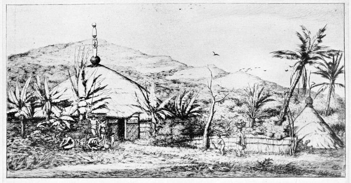 PLATE 43. NOUVELLE-CALÉDONIE. GRANDE CASE INDIGÈNE SUR LE CHEMIN DE BALLADE À POEPO. (D. 67.) FOURTH STATE. 55/8 × 9¾ in.