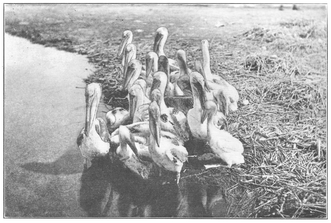 I have great respect for the pelican, a respect which increases each time I see him, he is such a venerable gaffer of a bird. Even in the confines of his hen-fenced enclosure at the ostrich farm in Jacksonville, he does not lose this aspect of dignity. The group sitting and flitting about their tiny tank always reminds me of the delineations of the Hebrew prophets in the mural decorations of the Boston Public Library. They (the pelicans) have a faintly straw-colored top to the head which reminds one of a bald and massive dome of thought, and they draw their beaks back against their necks till they are for all the world like long beards. Then there is an intellectual solemnity about them that I am sure their character does not belie. Even when they play at leap-frog, clumsily flopping one over another in the pool, they do it in a way that convinces you that they have it all reasoned out and are not entering into it lightly or without due consideration. They are a clean bird in captivity and are so quaintly awkward in their movements that one loves them at sight.