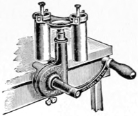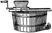 6. The Marschall Rennet Test consists of a graduated cup (a) with a fine hole for an outlet in the bottom. One cubic centimeter of a standard rennet extract is diluted with water in the glass bottle (c). The cup is filled with milk and placed on the corner of the cheese vat, the milk being allowed to run through the fine hole in the bottom of the cup. The moment the surface of the milk reaches the upper mark of the graduation in the cup the diluted rennet extract is added and quickly stirred into the milk with the spattle (d).