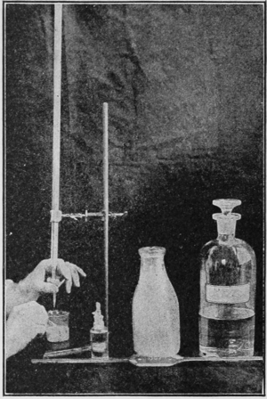 3. The Acid Test depends upon what in the laboratory is called “titration” and makes use of a “burette,” a long, graduated measuring tube provided with a pinch-cock. This burette is filled with an alkali solution of known strength, usually a “tenth normal” solution of caustic soda. A certain amount of the milk to be tested is measured off into a glass or a white porcelain cup. As a 17.6 c.c. pipette belonging to the Babcock test usually is at hand, that may be used for this purpose. A few drops of an Indicator is added to the milk and under constant stirring the soda solution is allowed to drip into it until suddenly it turns pink. The color will quickly disappear, however, and a few more drops of the alkali are added and stirred in several times until a faint but distinct pink color remains for some time. That indicates that the acid in the milk has been neutralized and the amount of the soda solution consumed is then read off on the scale on the burette. By dividing the number of c.c. of the soda solution used by two, the tenths per cent of lactic acid in the milk is found. For example, if it takes 4 c.c. of the soda solution to neutralize 17.6 c.c. milk, the acidity is .2%. This depends upon the fact that 1 c.c. of a tenth normal soda neutralizes .009 gram of lactic acid and that therefore the per cent of acid in the milk is equal to .009 multiplied by the number of c.c. of soda solution used, divided by the number of c.c. of milk and multiplied by 100.