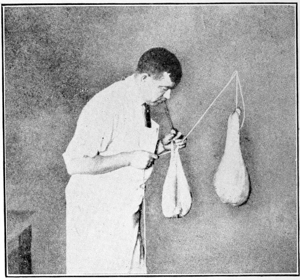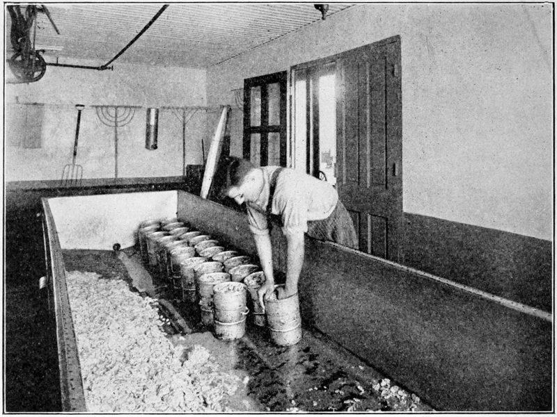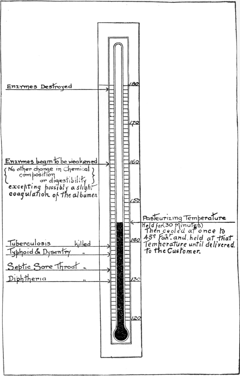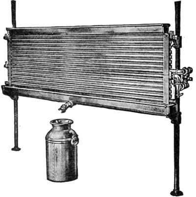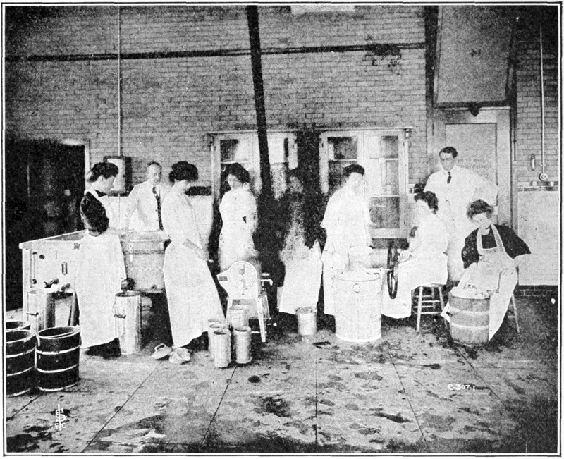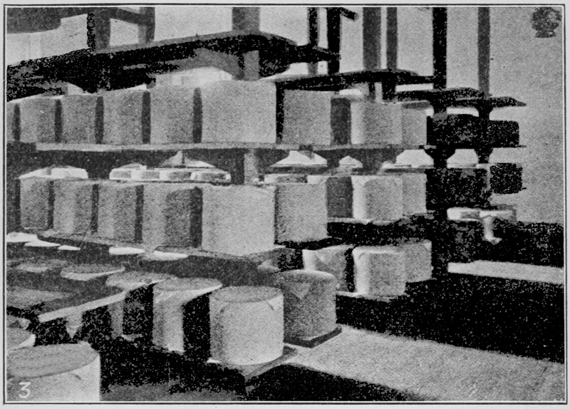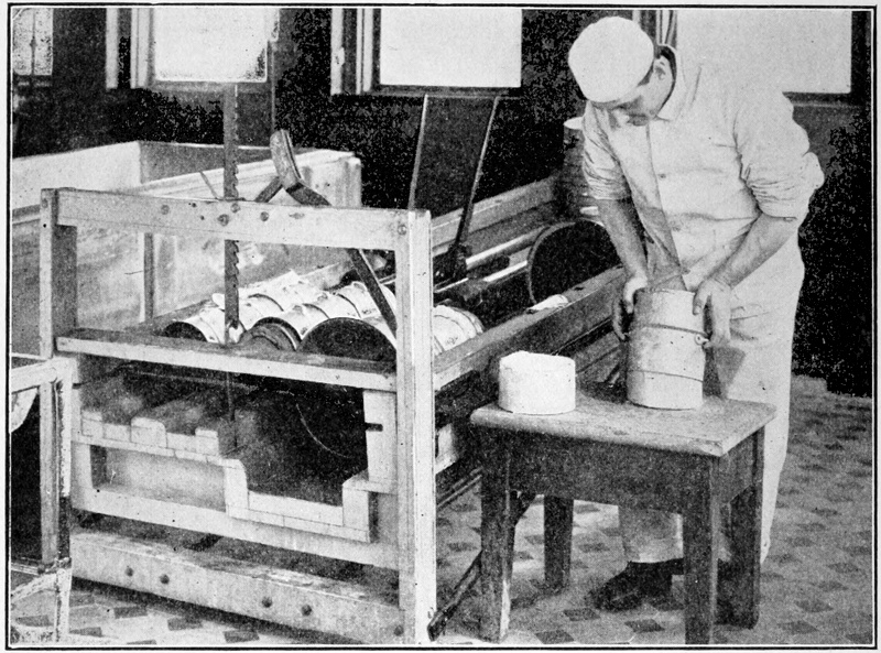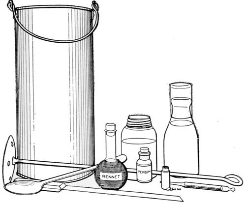 8. Rennet (see under “Ferments” in Chapter I) is prepared from the third division of the stomach of the suckling or milk-fed calf. Fifty years ago cheesemakers used to make their own rennet by soaking salted calves’ stomachs in sour whey, and our grandmothers used a piece of a dry, salted stomach to make Junket or “Curds and Whey.” About 1868, Christian Hansen, of Copenhagen, Denmark, began the preparation of Commercial Rennet Extract which soon supplanted the home-made rennet in all countries wherever cheese was made. Nowadays rennet in liquid or powder or tablet form for cheesemaking, and Junket Tablets for milk puddings, are prepared pure and of known strength in laboratories and handled by druggists and dealers in dairy supplies.