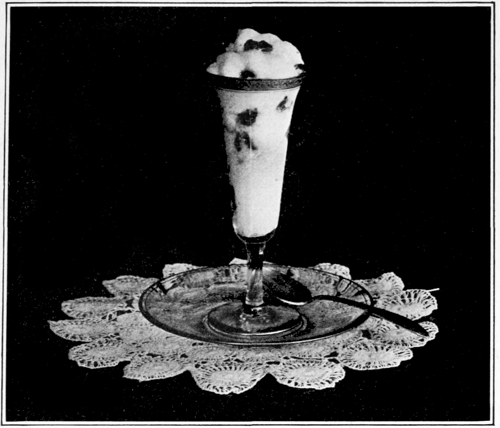 Soak gelatine in the cold milk for 10 minutes. Heat balance of milk in a double boiler, add salt, sugar and beaten yolks, stirring 179constantly. Cook until mixture coats the spoon, remove from fire, add soaked gelatine and stir until dissolved. Then set aside to cool and when beginning to thicken add flavoring and mix in lightly the stiffly beaten whites.