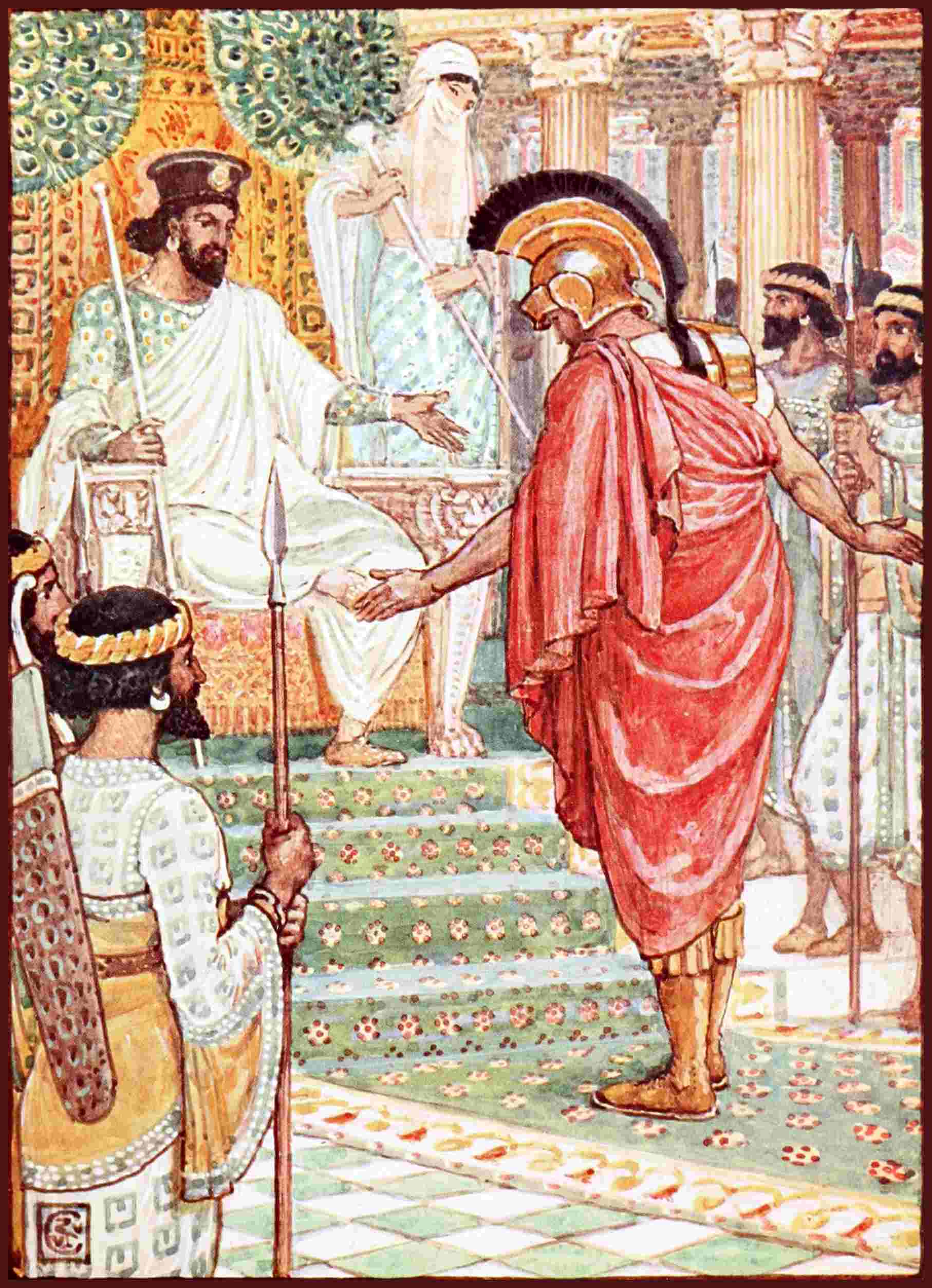 Alexander had seen how bravely his enemy had fought, As he watched him riding from the field, he thought he would like to speak with so great a warrior, and he sent to ask him to return. He himself went out to meet the king, and was amazed at his great height and at his beauty.