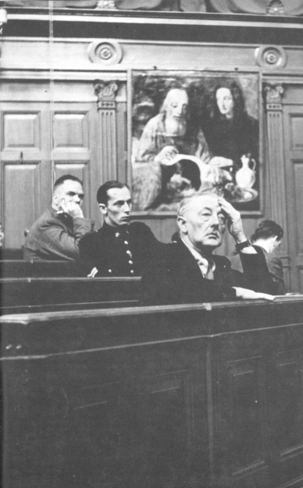 Han Van Meegeren listens to the evidence at his trial in Amsterdam. In the background is “The Blessing of Jacob”, which was sold in 1942 as the work of Vermeer.