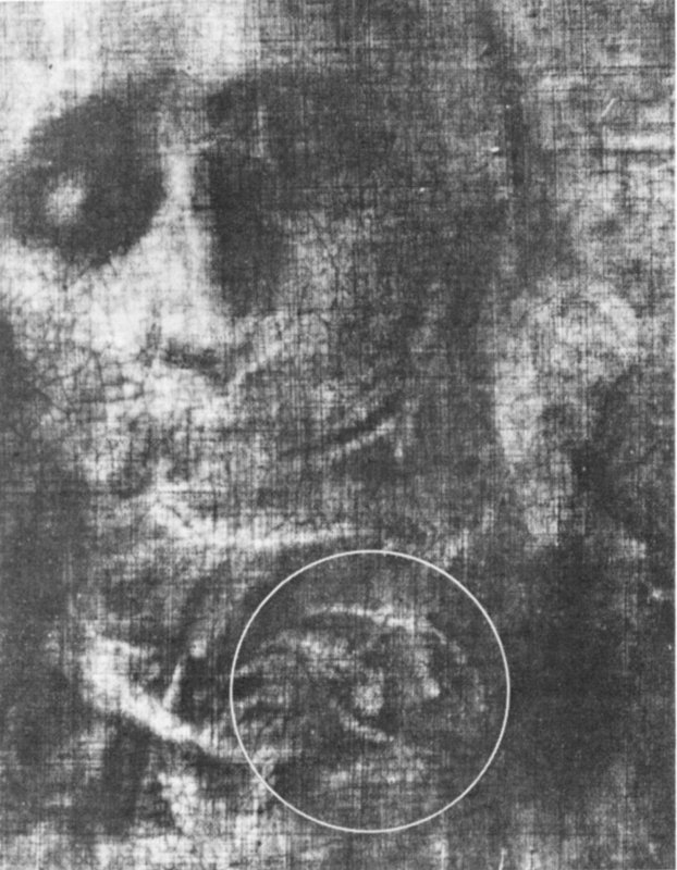 An X ray of part of the Van Meegeren forgery, “Christ and His Disciples at Emmaus”. In the white circle are traces of paint from the original painting that Van Meegeren scraped off to obtain the old canvas. When the painting was believed to be a genuine Vermeer, it was sold for about $300,000.