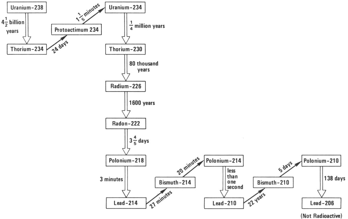 The Uranium Series. In this simplified diagram, the double vertical arrows represent alpha radioactivity and the single slanted arrows represent beta radioactivity. The times shown on the arrows are the half-lives for each step.