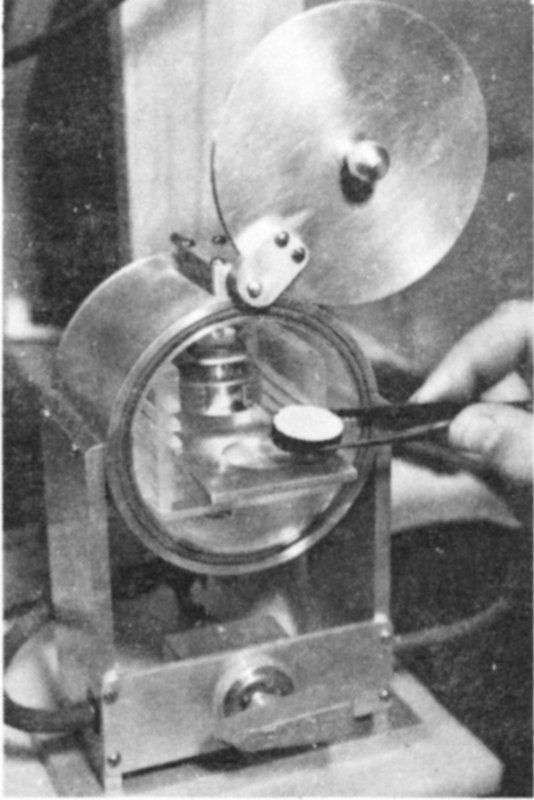 By forcing the solution through a special thin plastic filter having tiny holes, the particles of barium sulfate together with the radium that had been in the solution were caught on the surface of the filter. This was mounted on a solid disc so that it too could be placed in the alpha-particle spectrometer for the measurement of radioactivity from the radium.