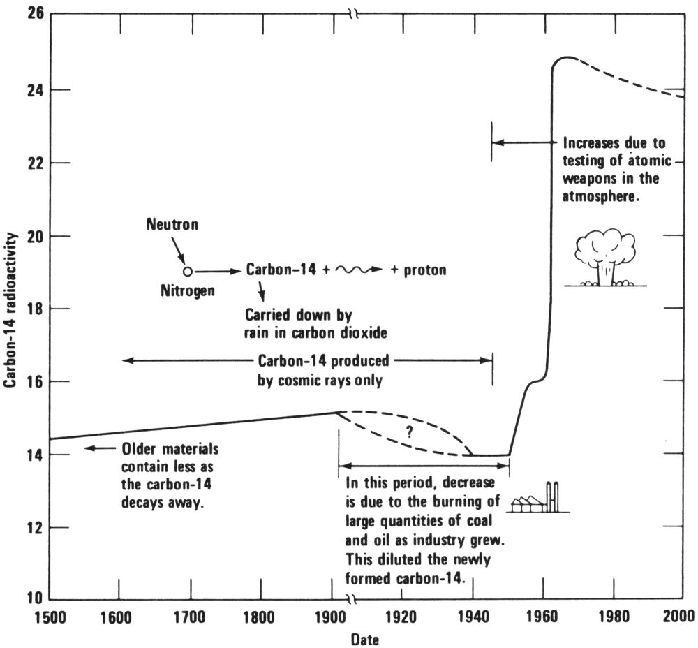 “The radioactive lead that we’re interested in has a half-life of only 22 years. This means that if you start with a small quantity of this radioactive isotope of lead, which is called lead-210,[1] then in only a few hundred years it would have disappeared. However, in rock, where there is uranium, the uranium keeps feeding the elements following it in the series, so that as fast as they decay they are reproduced by the element before them.”