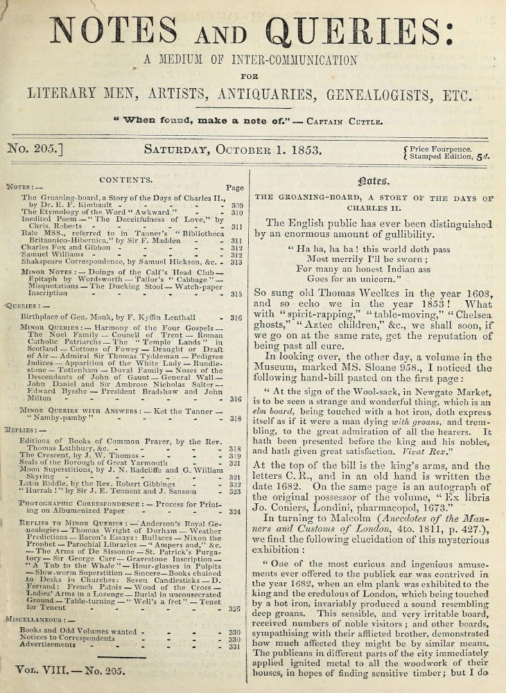 | The Groaning-board, a Story of the Days of Charles II., by Dr. E. F. Rimbault | 309 |