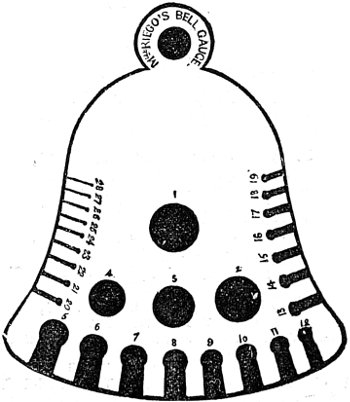 To insure correctness in the size of the Needles used in Mdlle. Riego’s publications, a drawing of the Gauge by which they are numbered, is now given. All Knitting Needles are measured in the circle close to the numbers. Tricot Needles the same, gauging by the stem.