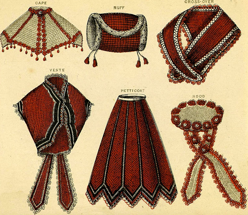 Materials—For the Cape, 4 ounces of single or double Wool, and for the Trimmings 3 skeins of double Berlin Wool of a color which contrasts; Walker’s Tricot Needle No. 7 Bell gauge, a large Tatting Shuttle, and a round Mesh No. 1 Bell gauge.