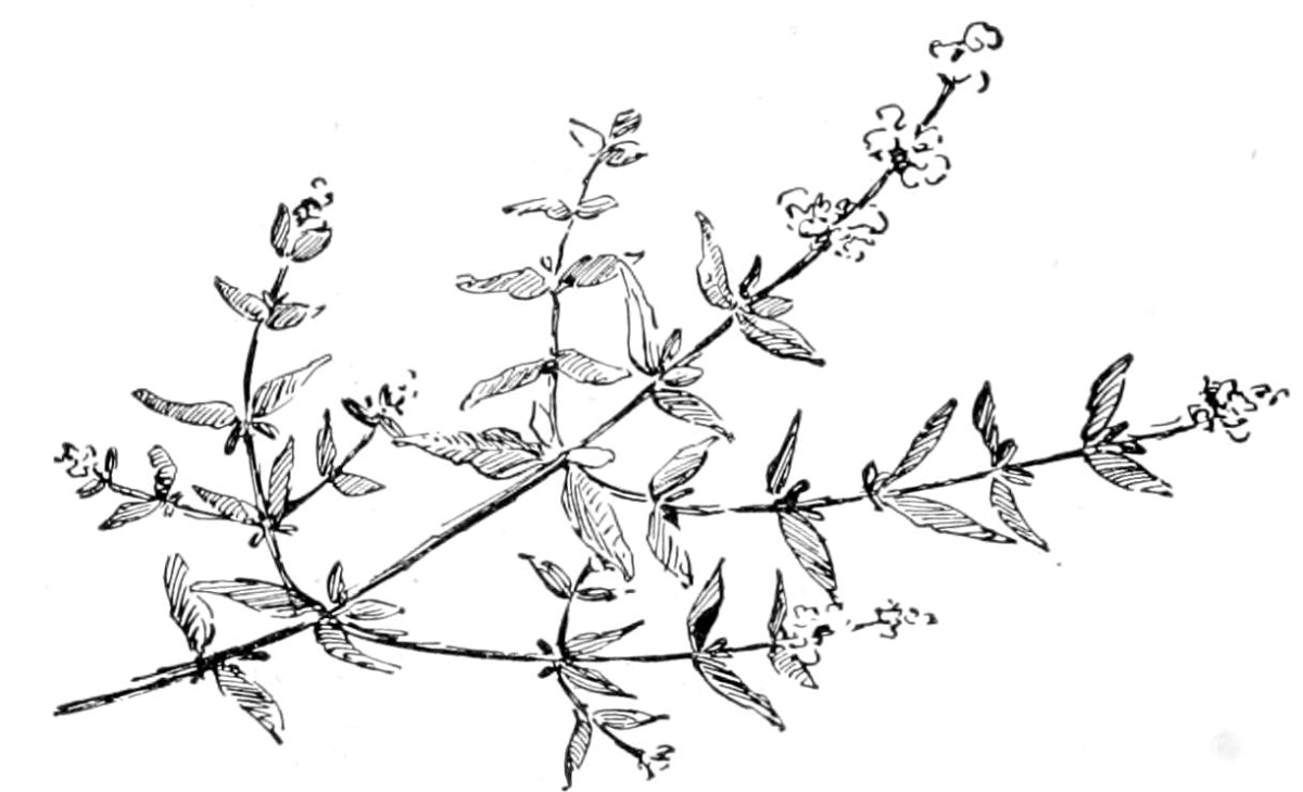 Thyme, a little under shrub native to the Mediterranean countries, is allied botanically to sage, summer savory and sweet basil. It possesses very small leaves and whorls of tiny, lilac-colored flowers, from which thymol or oil of thyme, a valuable germicide, is distilled. In flavor it is fragrant and aromatic and it may be readily cultivated in gardens. The wild thyme of our banks “where ox-lips and the nodding violet grows,” is a different variety of the[Pg 20] same order. Its name is derived from the Greek word thumos, meaning incense or perfume.