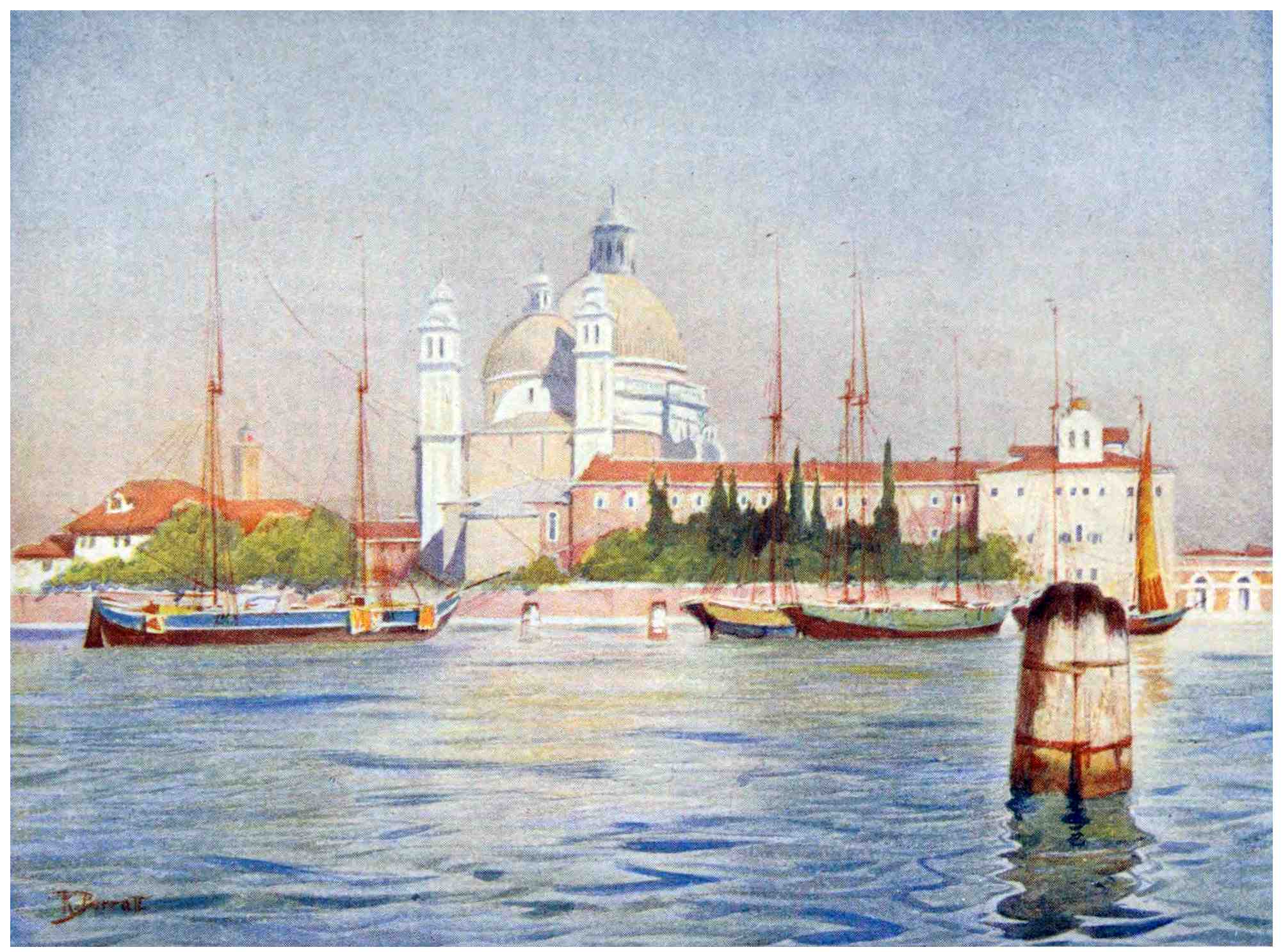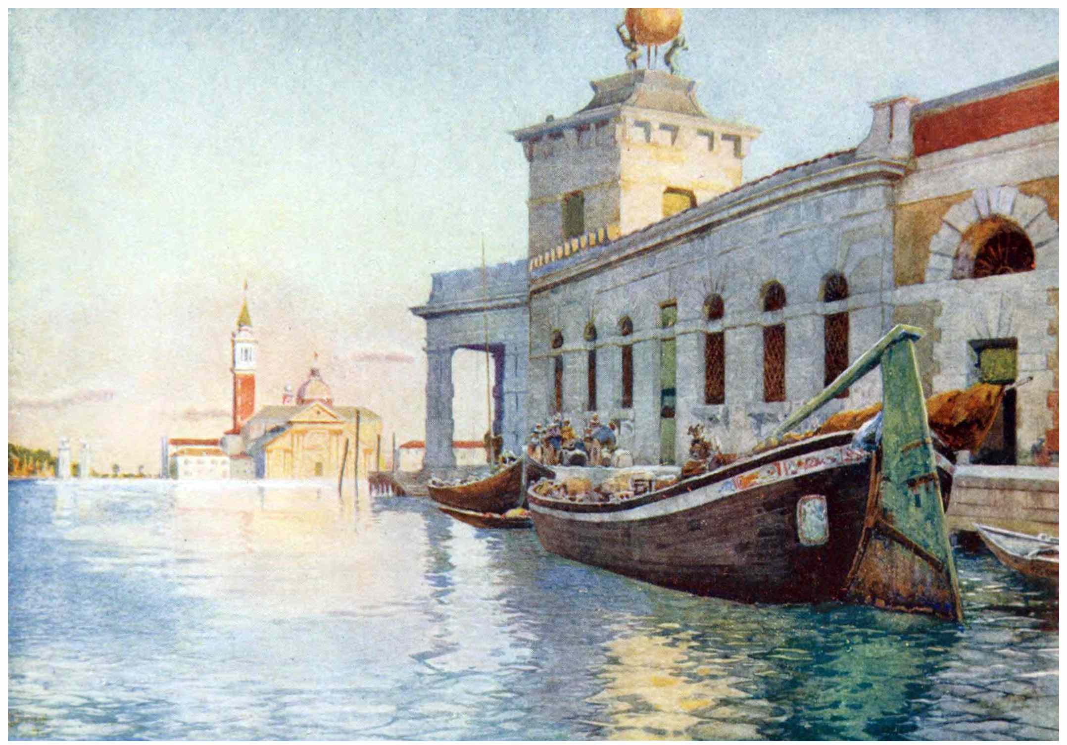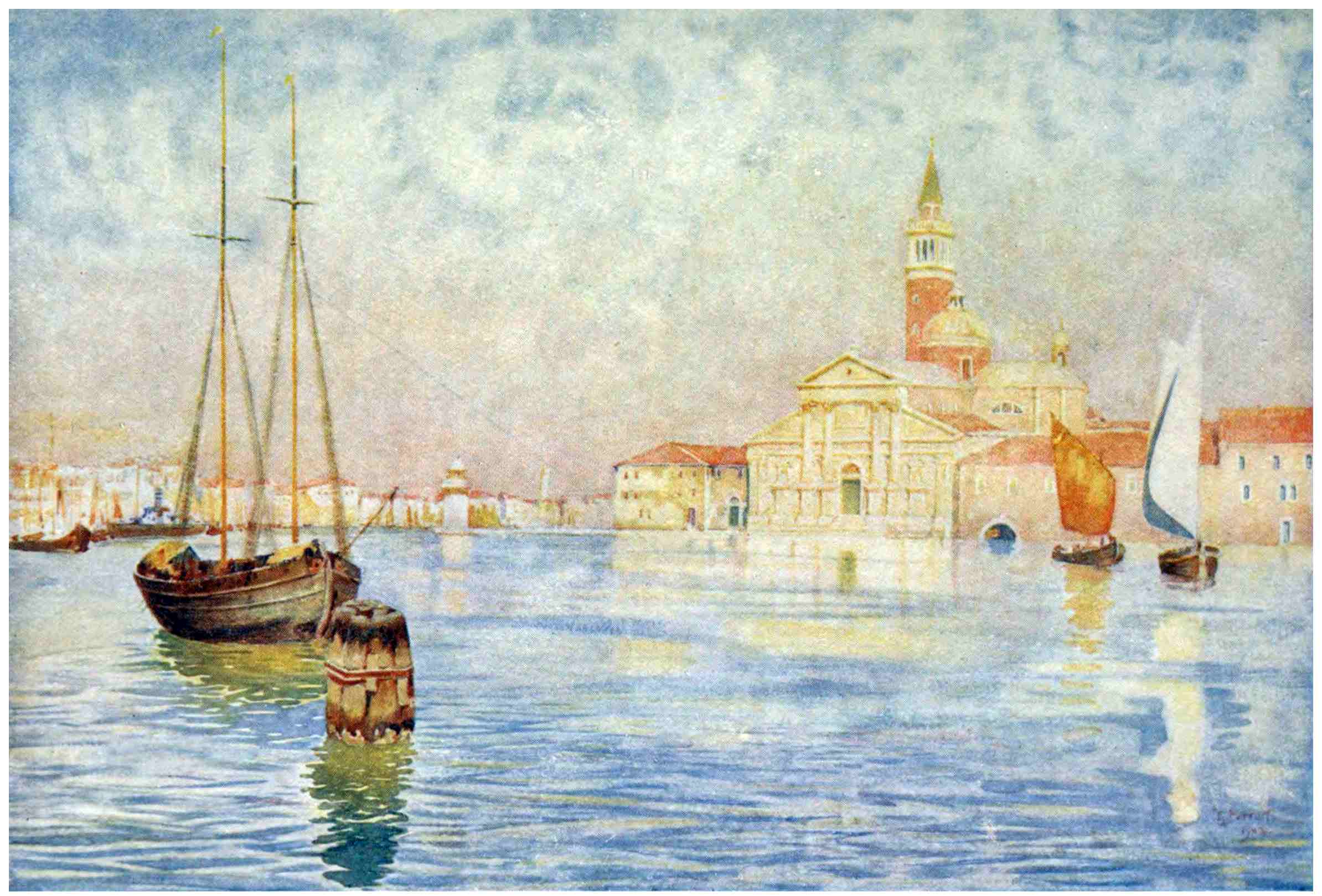 And if in the middle day we realise this priceless dowry of Venice, it is in the twilight of morning or evening that her treasury is unlocked and she invites us to enter. Turner’s Approach to Venice is a vision, a dream, but not more divinely lovely than the reality of Venice in these hours, even as she appears to duller eyes. Pass down the Grand Canal in the twilight of an August evening, the full moon already high and pouring a lustre from her pale green halo on the broad sweeping path of the Canal. The noble curves of the houses to west and south shut out the light; day is past, the reign of night has begun. Then cross to the Zattere: you pass into another day. A full tide flows from east to west, blue and swelling like the sea, dyed in the west a shining orange Where the Euganean hills rise in clear soft outline against the afterglow, while to the east the moon has laid her silver bridle upon the dim waters. Cross to the Giudecca and pass along the narrow, crowded quay into the old palace, which in that deserted corner shows one dim lamp to the canal. The great hall opens at the further end on a bowery garden where a fountain drips in the darkness and the cicalas begin their piping. Mount the winding stair, past the kitchen and the great key-shaped reception room, and look out over the city—across10 the whole sweep of the magnificent Giudecca Canal and the basin of San Marco. The orange glow is fading and the Euganean hills are dying into the night, while near at hand one great golden star is setting behind the Church of the Redentore, and the moon shines with full brilliance upon the swaying waters, upon the Ducal Palace and the churches of the Zattere, with the Salute as their chief. The night of Venice has begun; she has put on her jewels and is blazing with light. At the back of the house, where the lagoons lie in the shimmering moonlight, is a silent waste of waters under the stars, broken only by the lights of the islands. This also is Venice, this mystery of moonlit water no less than the radiance of the city. And it is possible to come still nearer to the lagoon. Passing along a dark rio little changed from the past, we may cross a bridge into one of the wonderful gardens for which the Giudecca is famous. The families of the Silvi, Barbolini and Istoili, banished in the ninth century for stirring up tumult in the Republic, when at last they were recalled by intercession of Emperor Ludovico, inhabited this island of Spinalunga or Giudecca and laid out gardens there. This one seems made for the night. The moonlight streams through the vine pergolas which cross it in every direction,11 lights the broad leaves of the banana tree and the dome of the Salute behind the dark cypress-spire, and stars the grass with shining petals. The night is full of the scent of haystacks built along the edge of the lagoon, beside the green terrace which runs the length of the water-wall. Then, as darkness deepens, we leave to the cicalas their moonlit paradise, and glide once more into the Grand Canal. It is at this hour, more than at any other, that, sweeping round the curves of that marvellous waterway, it possesses us as an idea, a presence that is not to be put by, so compelling, so vitally creative, is its beauty. Truly Venice is poetry, and would create a poet out of the dullest clay.