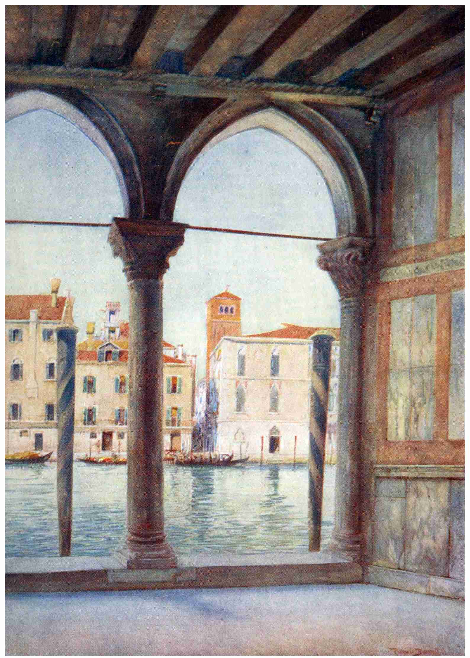 We strike almost immediately into the Rio della Misericordia, and as we look down the long vista to right and left of us, under the low bridges, we begin to realise the peculiar character of this district. It is entirely different from that of our first tour; long parallel canals run from east to west, cutting the land into narrow strips and giving the strips a curious effect of isolation. These canals are bounded on the west by the lagoon, and the effect of sunset light flooding the long waterways is strikingly beautiful. If we were to follow the Rio della Misericordia to the left, we should come to the curious wedge-shaped island of the Ghetto Nuovo and the tall deserted houses of the256 Ghetto Vecchio. But we will tend only slightly to the left, and passing under a low bridge continue our former course into the Rio della Sensa. This name has in it echoes of historic festivals; it originated in the fact that the stalls for the great Ascension fête on the Piazza were stored in the warehouses that stood on its banks. As late as the last celebration of this famous offshoot of the Sposalizio festival, in the year 1776, fifty-seven thousand ducats were spent on erecting the enclosure in which the stalls were set up. The Rio della Sensa has many links with the past. Above a door in a humble wall on the fondamenta hangs a shield on which is sculptured an arm cased in steel. This shield belonged to the Brazzo (Braccio) family, of Tuscan origin, who had settled in Venice and acquired much land in this district. The name is worthy of preservation; for one at least of the family has left an enduring mark in the annals of the city. “In 1437,” we read in Tassini’s Curiosità Veneziane, “a Geoffrey da Brazzo, with some companions, founded, in the Campo di SS. Giovanni e Paolo, the Scuola di San Marco of which he was the Grand Guardian.” Within the unpaved court the house of the worthy Geoffrey is still standing, and it preserves its early Gothic and Byzantine features but259 little obscured by later additions. It is not altogether gloomy though evidently inhabited by very poor people; little gardens still blossom from the leads and window boxes, and tables and chairs are set out under the vine in the yard below. In the seventeenth century the family became extinct, its history being closed by a rather sordid domestic tragedy; and it is pleasanter to revert to the earlier days of this simple, dignified citizen’s dwelling when Geoffrey and his associates discussed in it the hopes and fears of their School. Another page of Venetian history lies open for us at the Campo dei Mori further along the same rio to the right. Our attention is attracted at once by a curious figure in oriental turban, with a pack upon its head, at the corner of the square which strikes the fondamenta. Two more figures in the same style of dress are stationed at other corners of the square. The crowd of urchins who throng round us the instant we alight will tell us that these are Sior Rioba and his brothers. The key to these figures is to be found in a palace, the inner court of which opens on our right hand as we turn inwards from the canal. It belonged to three Greek brothers, by name Rioba, Sandi and Afani, of the family Mastelli, who leaving the Morea in the twelfth century, on account of disturbances260 there, came with great wealth to Venice and built themselves this house by the campo which has preserved their origin in its name. This family also has a noble record in Venetian annals. It took part in the Crusade of 1202, and received citizenship for its reward. Later it rested from its labours and set up a spice shop in Cannaregio at the sign of the Camel. From these avocations it passed to a more reposeful existence on the banks of the Brenta, and, like the da Brazzo family, it became extinct in the seventeenth century. The courtyard of the palace, known now as the Palazzo Camello, possesses many fascinating reminders of its past, though some of its old beauties have been taken from it even in recent years. The open arches of the sotto-portico have been filled in, and a corkscrew stair is now only recognisable by the pillars we see immured in a circular tower. The pillars that once supported the arches of the entrance portico, now half buried in the ground from the constant raising of its level, are fine and uncommon examples of the transition from Gothic to Renaissance. Above the portico are two striking projections of carved stone, once serving perhaps to support a lantern or coat of arms, and in the angle of this wall and the main building are the relics of a Gothic pedestal on261 which, without doubt, some image has stood. The low-beamed court to the water is still intact with its finely-carved architraves and early Gothic pillars; but beyond the point of its present habitation it has been allowed to fall into decay from the invading damp. If we venture along this outer court to the water’s edge, we shall find ourselves in the Rio della Madonna dell’ Orto almost opposite the campo and church. By the help of a barge which we may reasonably hope to find moored alongside the water-door of the court, we obtained a view of the most characteristic aspect of the Palazzo Camello. The passer-by on the fondamenta cannot fail to be impressed by its beautiful decorative balcony and windows and the Byzantine frieze in a lower storey, but above all by a camel and driver sculptured in admirable relief on the wall.