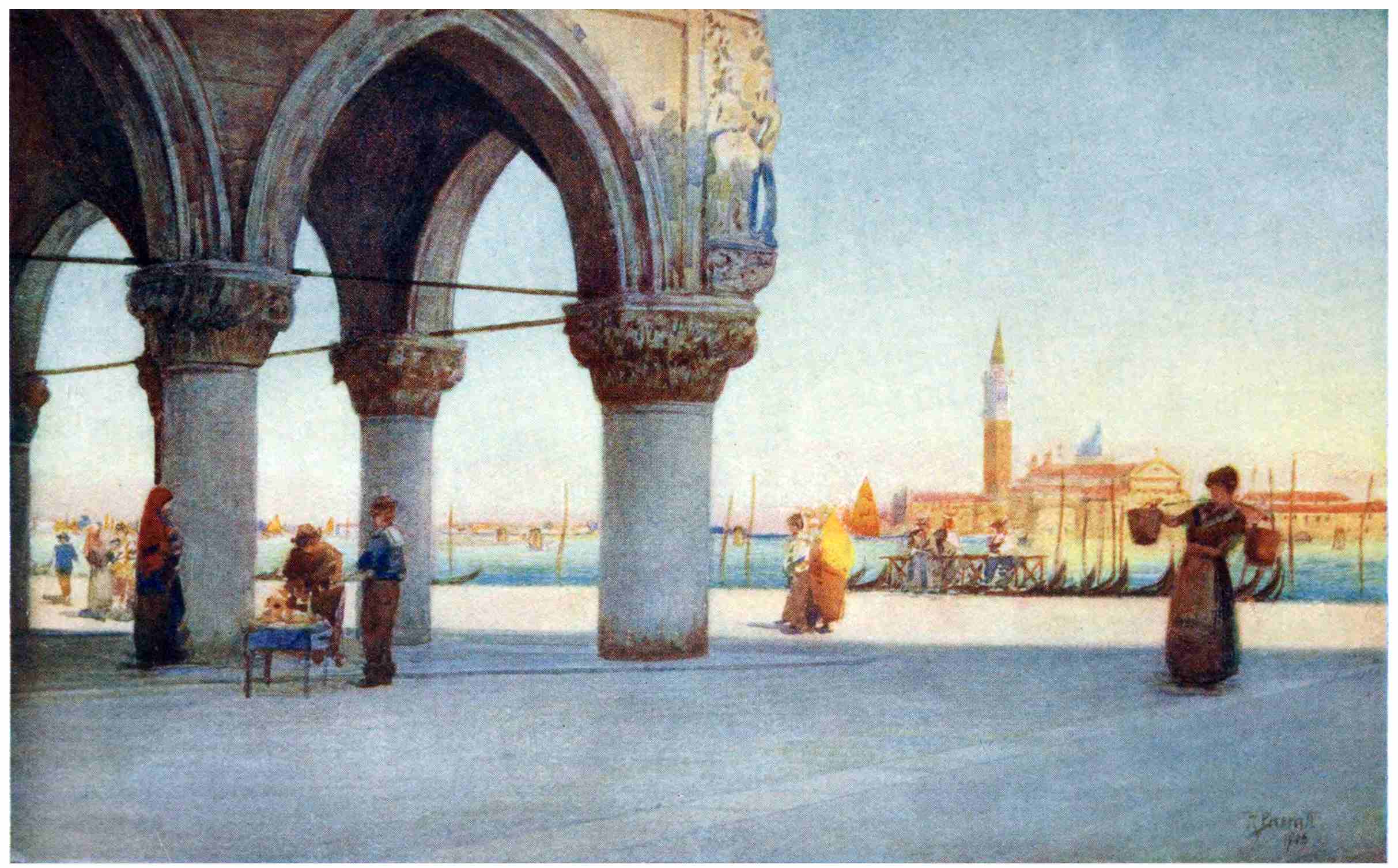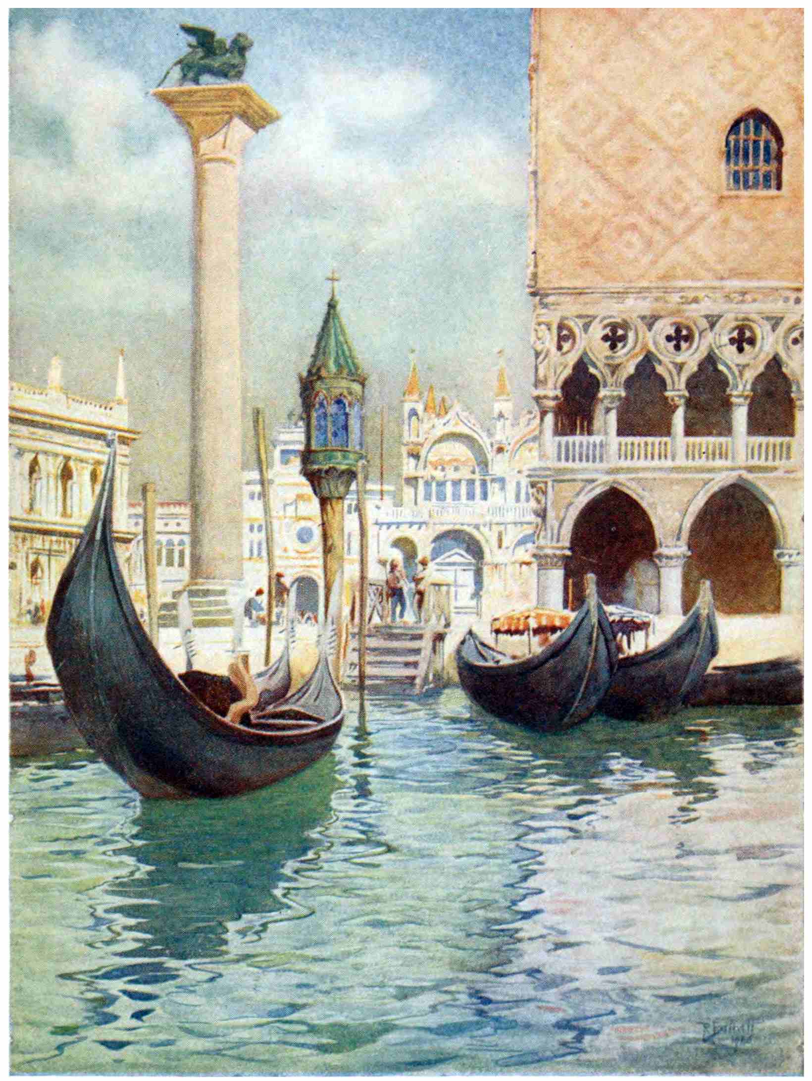 The Ponte Canonica, which adjoins our first Capello Palace, now allows us an easy passage, and we can take our way on the ebbing tide down the Rio del Palazzo. Below the sombre weight of252 the Bridge of Sighs, between the palace and the prison, we pass again into the aureole of Venice. Within the brilliant bay formed by the Riva degli Schiavoni the gulls are making festa, and away towards the city they whirl and drift like shining snowflakes in the radiance of the Grand Canal. As we pass the Piazzetta to land at the Molo, the golden sword of Justice gleams superbly luminous in the blue above San Marco. Venice has put on her glory.