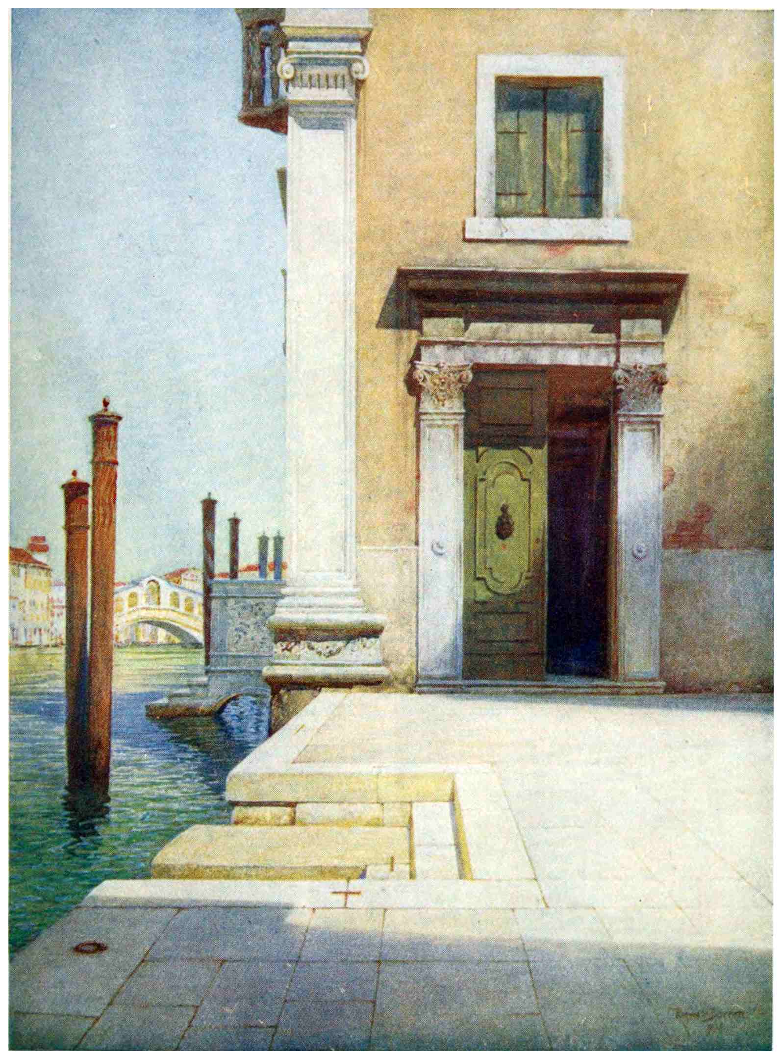 The last joy of one who has lived long in Venice, as well as the first of the new-comer, will be a gondola journey. It is impossible to exhaust the certain beauties of even a side canal, not to speak of its casual surprises. If we are in haste and time is precious, we do better to make our way over bridge and calle with what dexterity and speed we can; for it is an insult to ask haste of the gondola. Yet, if we accept in the right spirit the extraordinary delays and dilemmas of traffic—immense, interminable barges suddenly blocking the entire canal, or a flock of gondolas and sandolos in seemingly inextricable confusion—we shall always have our reward; not only the pleasure of watching the riddle of passage solve itself, thanks to the seeming elasticity of the rio, but a glint of sun-jewels on a new angle of the waters, some richness of ornament on house or bridge, some relic of ancient Venice, some name of calle or rio will break upon us with a fresh revelation. We cannot come to the end of Venice; she is inexhaustible: stealing about among the sudden shadows and broken lights of her waterways, sweeping in full, swift tide round unexpected193 corners and under diminished bridges, some new idea breaks upon us unawares with irresistible persuasion. We cannot define its meaning; we cannot say why details in Venice have so great a significance. A window opened suddenly in one of the palaces at night—why does it seem so portentous? It is another of the manifold gifts of the waters to Venice, this gift of distinction. Venice is not like other cities in which a thousand acts pass unnoted. She has the distinction of a unique individual whose smallest action is fraught with a strange immaterial fragrance that is unmistakably its own. We cannot analyse the fragrance; we only recognise that it is a spiritual gift; it emanates only from subtle and penetrating natures; it is the aroma of life itself. To it we owe the strange excitement that invades us in Venetian waters, and makes a gondola tour far more than a novel mode of traversing a city. As we watch the citizens of Venice from the water, see them crossing a bridge, pausing to lean over, or carried in the stream of passengers, they too seem endowed with a singular vitality; their passing and their standing still appear alike purposeful and portentous. What history might not be written by questioning the windows that look out on the side canals, or the tides that have ebbed and194 flowed in their channels? It would be a work of many volumes; for the private records of Venice are not lacking in fulness. The Piazza of Bellini’s Procession of the Cross represents one side of Venetian life, its solemnity, its assurance, its pomp and colour; but the narrow waters know another side, the domestic festivities, the courtings, weddings and banquetings, and private hates. For she was strong in deeds of darkness as in deeds of light, and echoes of them still wash against the basements of her houses. Water is a safer confidant of blood than earth, and the waters of Venice have received their full share of such confidences. Ebbing tides washed out to sea the stains of violence and flowed in to pave the city anew, yet the atmosphere of the dark waterways is more enduring than material stains, and there is no dark deed of ancient Venice to which they may not still supply a realistic setting.