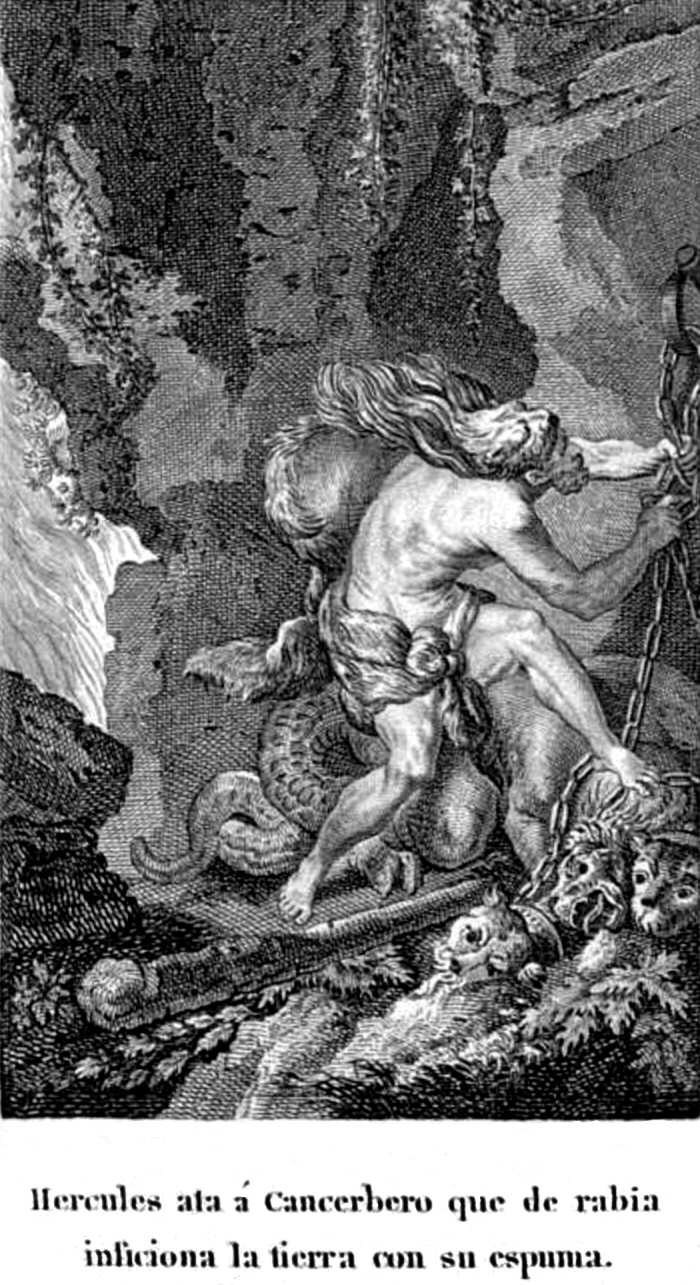 | Estampa 77: | Hércules ata á Cancerbero que de rabia inficiona la tierra con su espuma. |