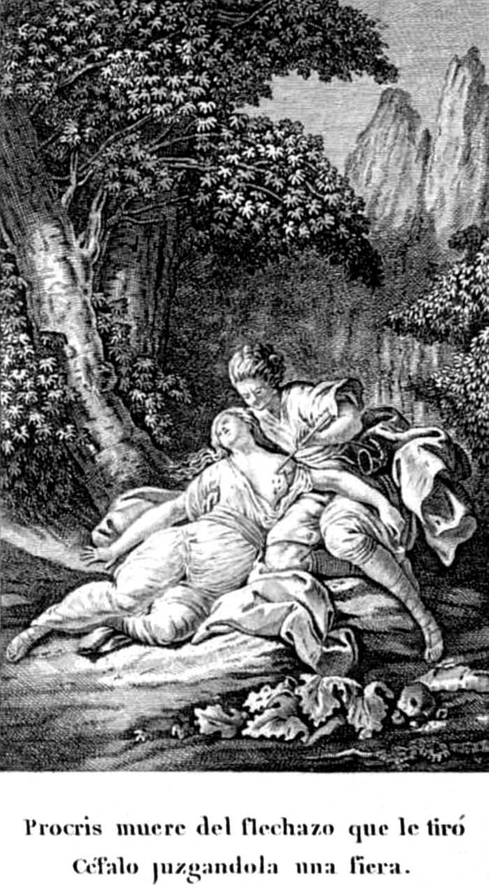 | Estampa 81: | Procris muere del flechazo que le tiró Céfalo juzgándola una fiera. |