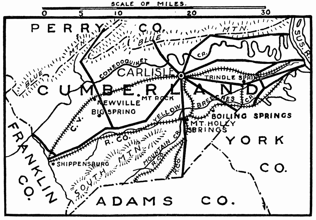 In the days following Braddock’s defeat in 1755, this region became the arena in which the red warrior of the forests and the white frontiersman fought to the death. Not a valley, creek, nor mountain range, site of modern city or town, but what was the scene of thrilling events, some of which influence the world for all time. Early settlers were Scotch-Irish, on the Aughwick, and in the great cove. Chief industries, iron ore, bituminous coal, and agriculture. Dickey’s Mountain, in the southeast, is rich in hematite and fossil ores.