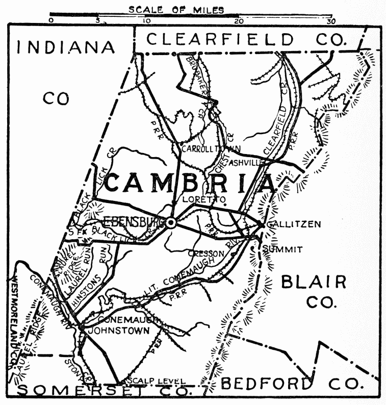 FORMED February 26, 1846; named for Honorable John Blair, native of this county, and public-spirited citizen; in 1820, he laid out, and was President of the Huntingdon, Cambria and Indiana Turnpike, first in this section. Blair County lies in the beautiful Juniata Valley, settled by Scotch-Irish, English, and Germans; much of the soil is very fertile. Chief industries, agriculture, coal mining, and manufacturing. It is the center of a network of roads, mostly built as turnpikes from 1830-50; now state roads.