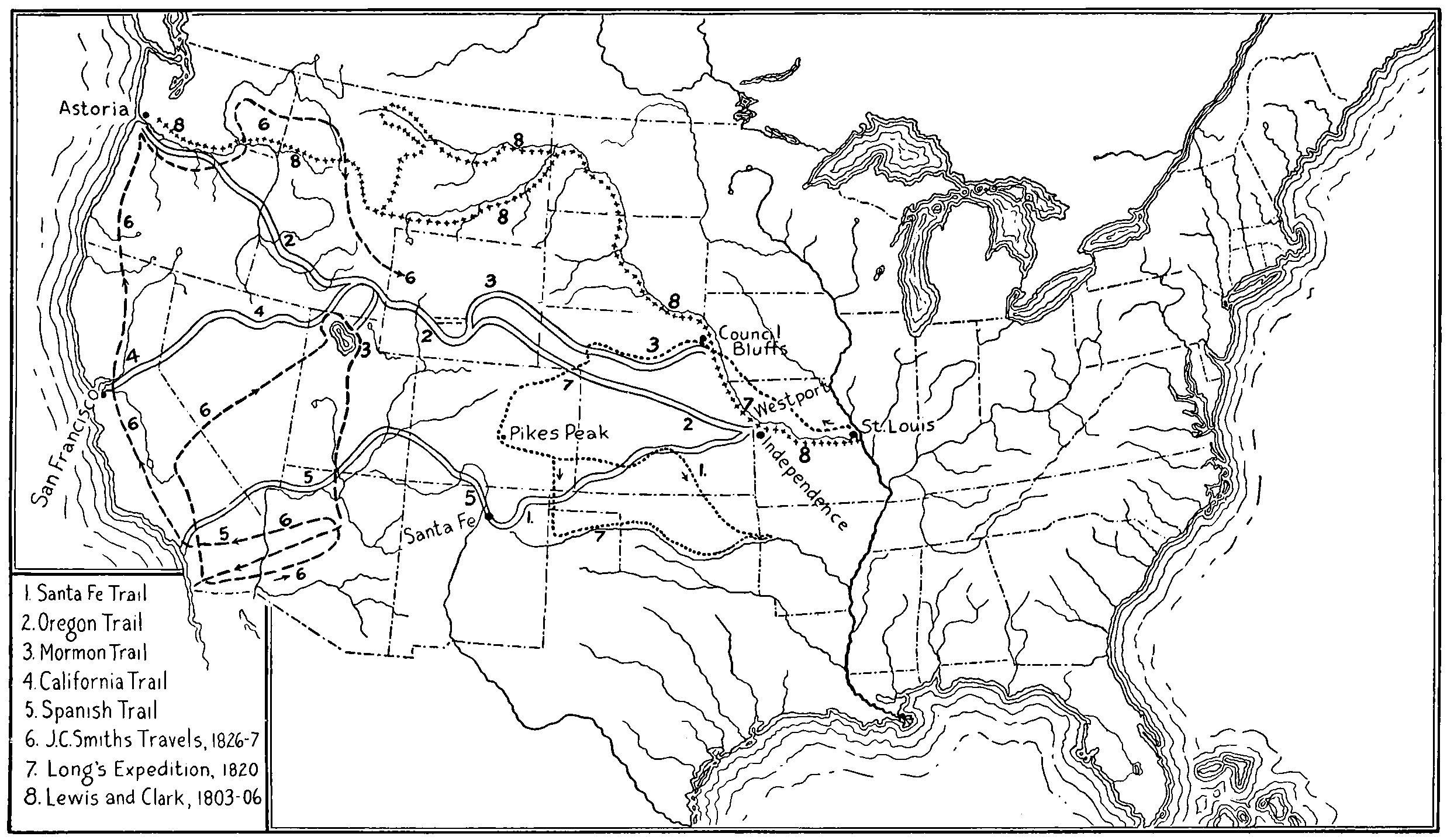 | First Settlements near Coast. Birch Bark Canoe, Meagerness of Roads. Settlement follows Waterways. Portages. Lines of Travel — Through Alleghanies, from the North, Boone’s Trace or the Wilderness Road, Calk’s Diary. Explorations — Marquette, Lewis and Clark, Fur Companies. Western Trails — Oregon, Salt Lake, Later California, Santa Fé, Gila and Spanish. Turnpike Roads, Wagon Road Neglect, National Participation — Cumberland Road. Early Inns. | |