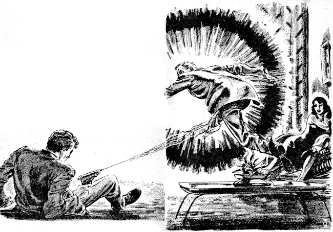 The time pistol was only a few feet away. Stan snatched at it and turned it on the still reeling Tanner. It caught the creature flush at the same time as he toppled back through the black velvet circle.