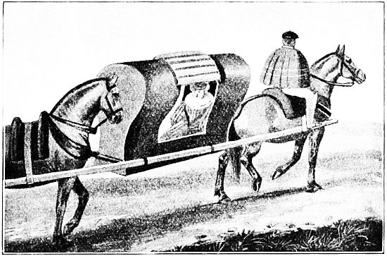 This vehicle was succeeded by Mr. Boulnois’ patent cab, of which an illustration is given. It opened at the back, and the driver’s seat was on the roof; the passengers sat facing one another. This cab was light and convenient, but appears to have fallen into disuse because the fore part was within too easy reach of the horse’s heels to make it quite acceptable to nervous passengers, Harvey’s “Quarto Bus” to carry four was the next popular conveyance, but it was superseded about 1836 by the “brougham cab” for two. This cab was rather smaller than the vehicle to which Lord Brougham’s name was given in 1839. From this conveyance was developed the “clarence cab,” which remains with us still as the familiar “four-wheeler.” It should be mentioned that the first four-wheeled cabs appeared in London about 1835; these however, carried only two[115] passengers inside. The modern hansom belongs to a later period. In 1802 there were 1,100 hackney carriages in London, and in 1855 the number was 2,706.