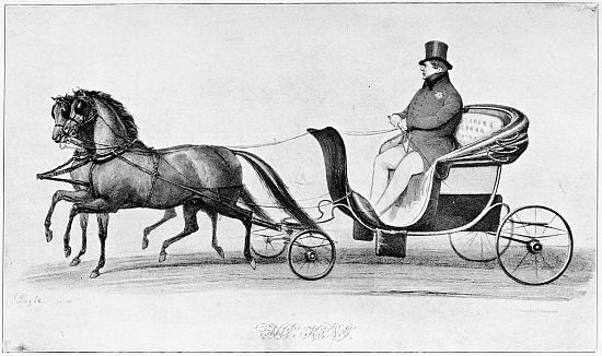 The Landau, invented at Landau in Germany, in 1757, was, about 1790, made to open in the middle of the roof or “hood,” and became very popular as combining the advantages of a closed coach with an open carriage; the chief objection to Landaus was the greasiness and smell of the blacking leather of which the hoods were constructed.[121] The name of the phaeton first occurs in a patent granted in 1788. Phaetons of various shapes came into fashion later: all were built to be driven by the owner, and probably gained much in popular esteem from the fact that George IV., when Prince of Wales, used to drive a “Perch High Phaeton” in the Park and to race meetings. Some of these vehicles were extravagantly high, and it was the correct thing to drive four horses in them at the fastest trot. The “Perch High Phaeton” was shaped like a curricle and had a hood. “The centre of the body was hung exactly over the front axle-tree, the front wheels were 4 feet high, and the hind wheels 5 feet 8 inches” (Thrupp).