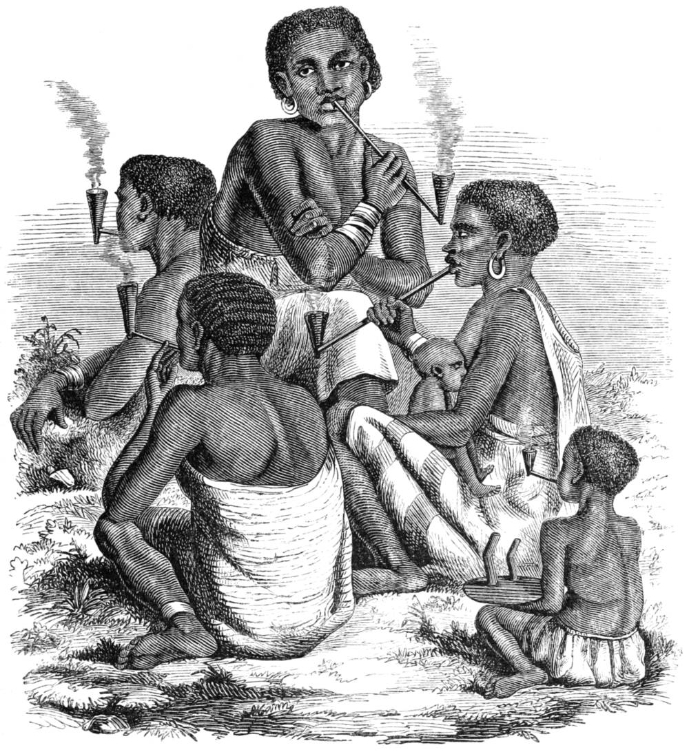 I halted two days at Yombo: the situation was low and unhealthy, and provisions were procurable in homœopathic quantities. My only amusement there was to watch the softer part of the population. At eventide, when the labours of the day were past and done, the villagers came home in a body, laden with their implements of cultivation, and singing a kind of “dulce domum,” in a simple and pleasing recitative. The sunset hour, in the “Land of the Moon,” is replete with enjoyments. The sweet and balmy breeze floats in waves, like the draught of a fan; the sky is softly and serenely blue; the fleecy clouds, stationary in the upper firmament, are robed in purple and gold, and the beautiful blush, crimsoning the west, is reflected by all the features of earth. At this time, all is life. The vulture soars with silent flight, high in the blue expanse; the small birds preen themselves for the night, and sing their evening hymns; the antelopes prepare to couch in the bush; the cattle and flocks frisk and gamble, whilst driven from their pastures; and the people busy themselves with the simple pleasures that [388] end the day. Every evening there is a smoking party, which particularly attracts my attention. All the feminine part of the population, from wrinkled grandmother to the maiden scarcely in her teens, assemble together, and sitting in a circle upon dwarf stools and logs of wood, apply themselves to their long black-bowl’d pipes.