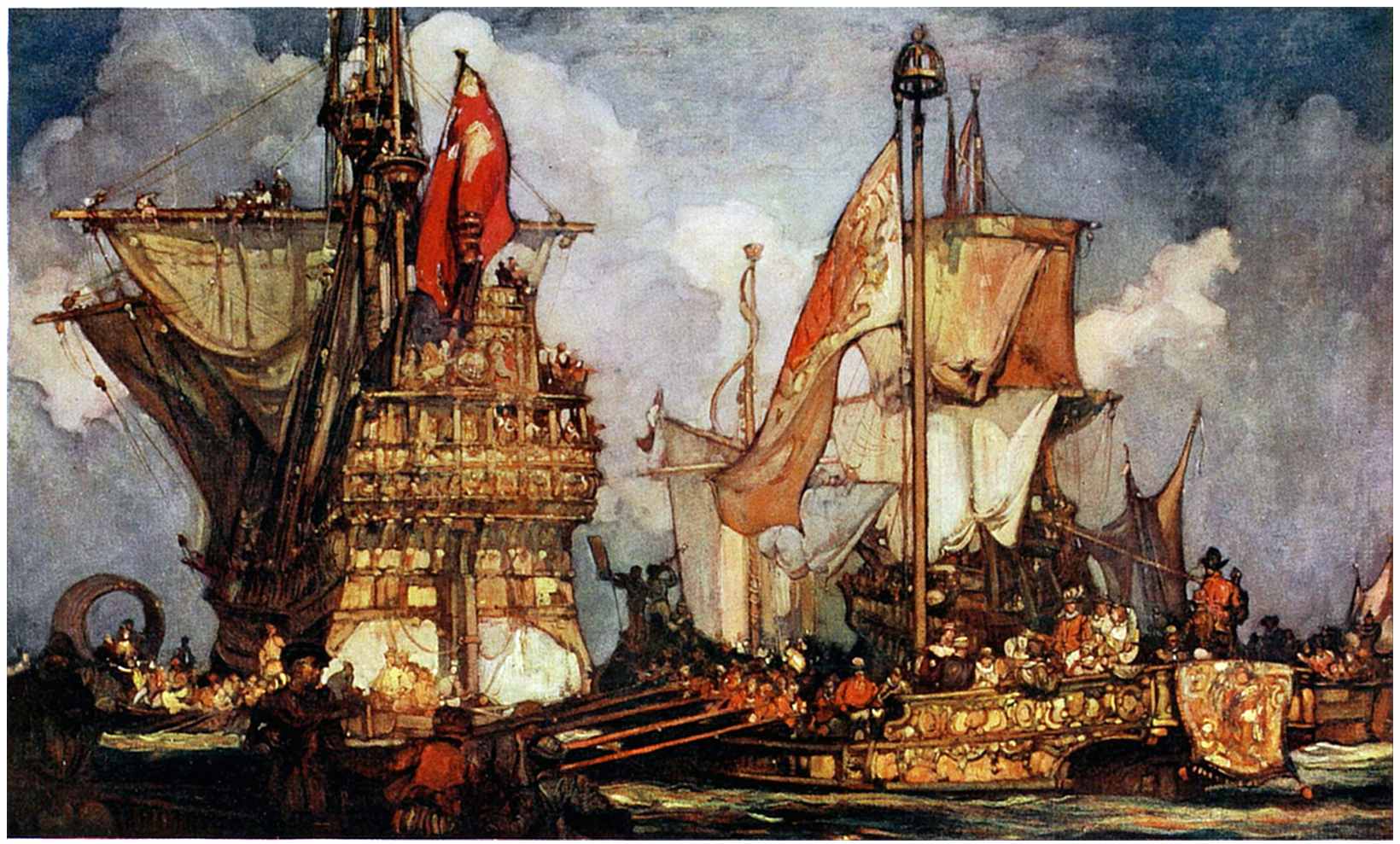 Hand, under the Northern and Southern Pole stars, victor over a hundred enemies, ballasted with royal treasure, & steered by the captured charts of Spanish Admirals, the little ship that sailed as the Pelican, comes home again as the Golden Hind. She brings her fabulous booty and her still more fabulous romance from Plymouth Sound to Deptford, and then and there the great names of the past—the Christophers, the Great Harrys, the Dragons and the Swans—are all finally eclipsed. Drake, kneeling upon her deck, receives his knighthood from the hand of Gloriana, and the Golden Hind herself, bidding farewell for ever to wind and wave, is laid up as a national monument—“consecrated to perpetuall Memory.”