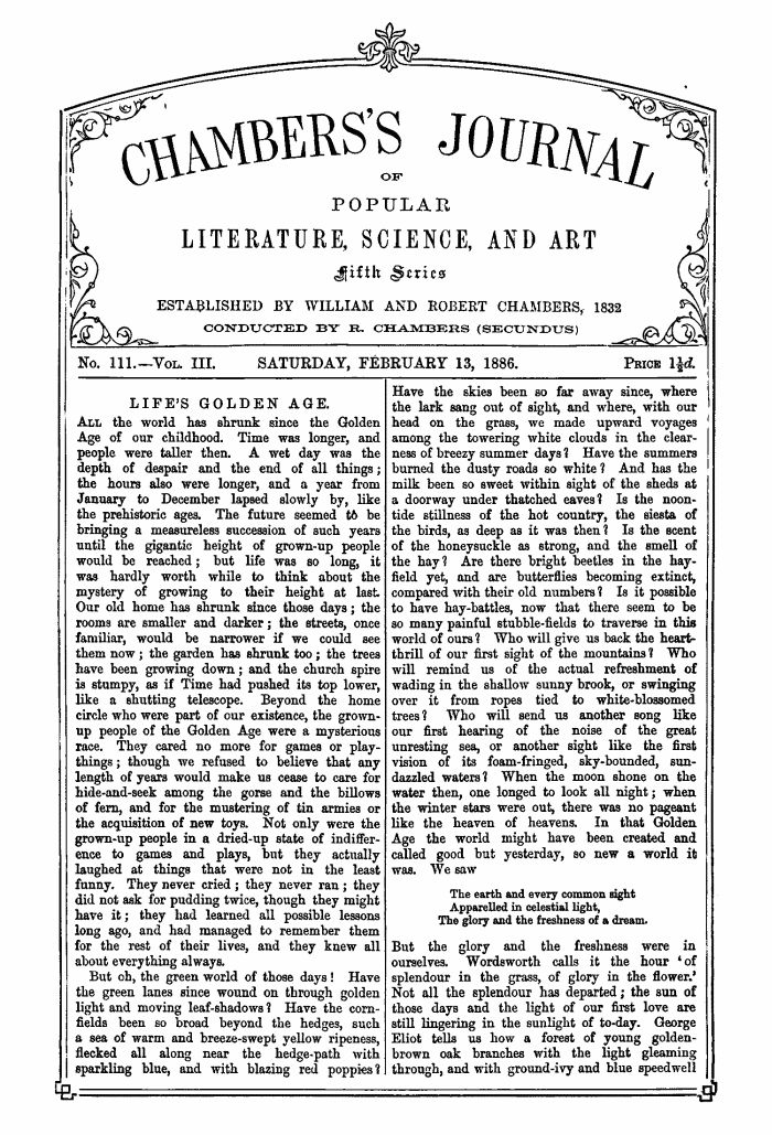 Title: Chambers's Journal of Popular Literature, Science, and Art, Fifth Series, No. 111, Vol. III, February 13, 1886