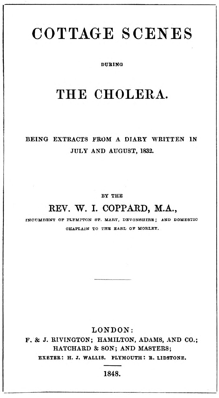 p. 4Up to the month of July, 1832, when that disease was making fearful havoc at Plymouth and the adjoining towns, a flattering hope was still entertained that, by the mercy of God, we should escape. But it pleased Him “who ordereth all things with infinite wisdom,” and “whose ways are past finding out,” that it should be otherwise; and on the 13th of July, the first instance of a case of the cholera in the parish, occurred at Underwood.