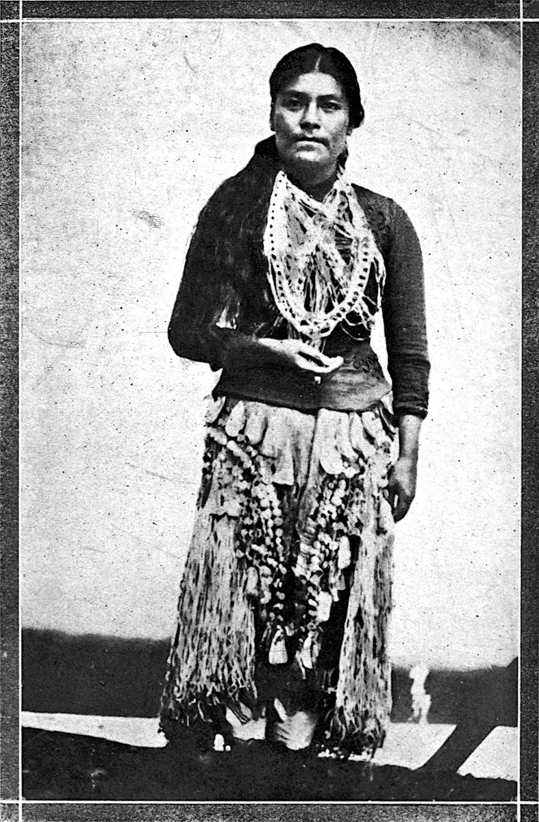In the high marriage of the Talth the woman is most beautifully dressed on her wedding day. A buck-skin dress all strung with beads and shells that clink and rattle with her ever graceful step. Her hair is parted in the middle, brought down on each side and rolled with the skin of the otter. This skin is nicely dressed or tanned and then cut into about one inch strips, thus holding the hair so it hangs down to their hips or lower, according to its length. Around her neck are strings of most beautifully arranged beads and of high value among them; they hang down to her waist, almost completely covering her chest. A buck skin, dressed and made as white as it can be made, goes over the shoulders and fastens around the neck and hangs down covering the back. This makes her very26 beautiful. She is so quick in movement that one has to keep their eyes on her closely to see all of her actions, while she speaks low and softly. These high marriages are very few and this beautiful sight of the bride is seldom seen. The girls born of these marriages were always looked up to by the Indians. When these girls came along or were met by any children of other births, the latter would always get out of the trail and let them pass.