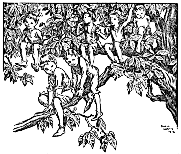 These young fairies were a long time dividing and munching the cake, and before they had finished, it began to be rather dark, for a black cloud came over and covered the little sunbeam. At the same time the wind rose, and rocked the boughs, and made the old tree creak and tremble. Then there was thunder and rain, and the little fairies were so frightened that they got out of the nest and crept into Jack’s pockets. One got into each waistcoat pocket, and the other two were very comfortable, for he took out his handkerchief and made room for them in the pocket of his jacket.
